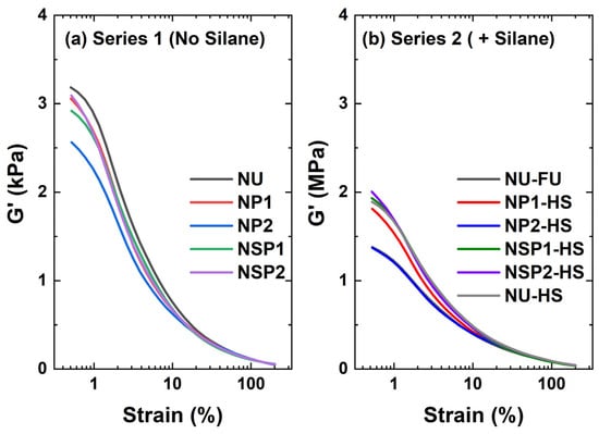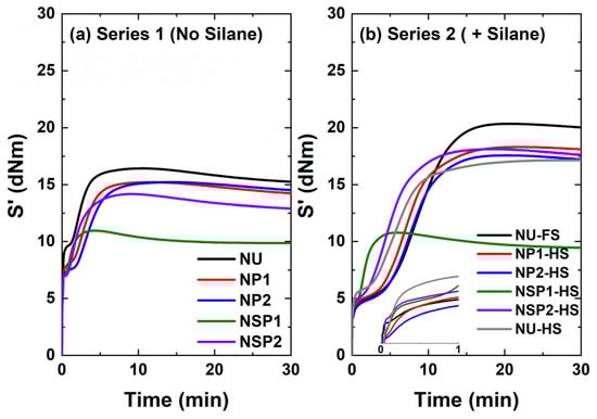 The increase in torque, ∆S′ (S′max−S′min), is affected by polymer-polymer, filler-polymer, and filler-filler interactions. The vulcanization curves of the different silica/NR compounds are shown in Figure 14. In the comparison of the system without a coupling agent (Figure 14a), the curve of the pure silica-filled compound (NU) shows a noticeable torque rise at the beginning of the vulcanization process. This behavior is associated with the flocculation of silica due to the polarity difference between silica and polymer [29] and the interaction of the silanol groups on the silica surface. This effect is significantly reduced in the compounds filled with plasma-treated silica. It was expected that plasma-treated silica would exhibit a higher ∆S′ than the compound with untreated silica due to the improved filler-polymer interaction achieved by the formation of sulfur crosslinks between the double bonds in the deposited layer and the polymer. However, Series 1 compounds showed negligible differences in torque increase except for those samples filled with DAS plasma-treated silica (NSP1). It exhibited an even lower torque increase (∆S′), which will lead to deteriorated vulcanizate properties, including mechanical and dynamic mechanical properties.