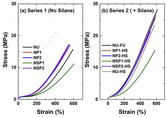 The stress-strain curves of the cured silica-filled NR compounds are compared in Figure 16. In Figure 16a, the plasma-treated silica NP1, NP2, and SP2 compounds showed improved mechanical properties compared to the non-treated silica-filled compound. However, no significant improvement was observed from a higher degree of modification of sample P2 compared to P1 in terms of mechanical properties, in accordance with the ∆S′ results and in contrast with the Payne effect results: the crosslinking network here is the main factor determining the mechanical properties. The DAS-PD-treated silica-filled compound, NSP1, showed lower mechanical properties than the other samples due to the lower torque increase, indicating a lower degree of crosslinking. Moreover, adding a coupling agent significantly improves the mechanical properties of the cured compounds compared to the no-silane system, as can be seen when comparing Figure 16a,b.