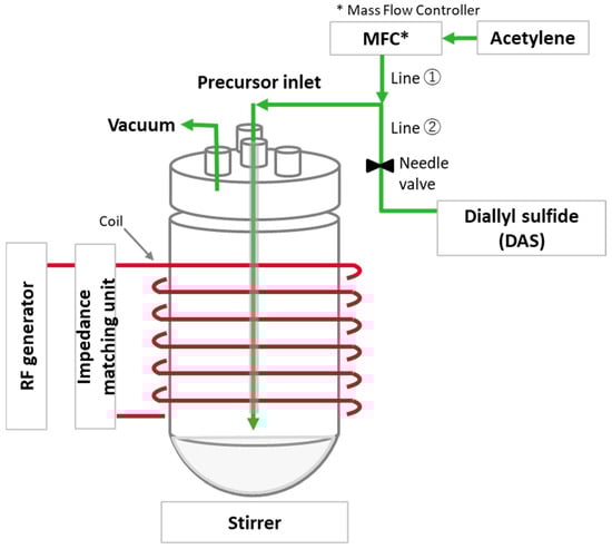 Determining the actual structure of the deposited layer is a challenge due to the crosslinked, high molecular weight network that forms on the silica surface by the combination of small fragments, radicals, and atoms generated in the plasma [14,17]. Nevertheless, it is possible to estimate the number of layers from the acetylene-PD: The number of carbons can be determined from the degree of deposition for a certain area, and assuming that carbons form a continuous graphite-like structure (i.e., a sp2 conjugated structure) on the entire silica surface, the number of layers can be estimated by considering the silica’s CTAB surface area. Based on this approach, the approximate number of carbon layers on the silica surface was calculated to be from 0.6 to 1.9 layers, as shown in Table 1.