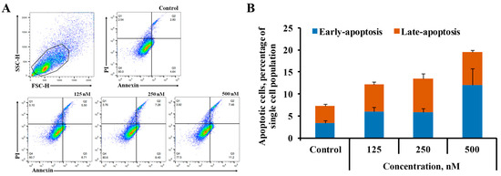 To evaluate the mechanisms of cell death induction after incubation with compound 2k, we used Annexin V and PI staining following an analysis using flow cytometry (Figure 2). After incubation with 2k at different concentrations up to 500 nM for 20 h, we observed a significant increase in the apoptotic cell count, compared to untreated control cells. Moreover, the increase in the apoptotic cell count was dose-dependent, reaching 19.3% (early apoptosis—12% and late apoptosis—7.3%) in the highest concentration tested. At the same time, the count of necrotic cells did not change significantly, indicating an induction of apoptotic cell death. These results indicate that the test compound 2k instigates programmed cell death mechanisms, which could be beneficial in terms of cancerous cells, as apoptotic cell death is not associated with the activation of severe inflammation.