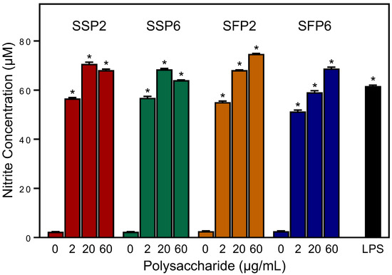 Figure 1. Effect of the Saussurea polysaccharides on macrophage NO production. Mouse macrophages were treated for 48 h with the indicated polysaccharide fractions, media alone (0; negative control), or 100 ng/mL LPS (positive control). NO production was quantified by measuring nitrite in the cell-free supernatants. The data are presented as the mean ± S.D. of triplicate samples from one experiment that is representative of two independent experiments. Statistically significant differences (* p < 0.01) between cells treated with media alone (0) and cells treated with SSP2, SSP6, SFP2, SFP6, or LPS are indicated.
