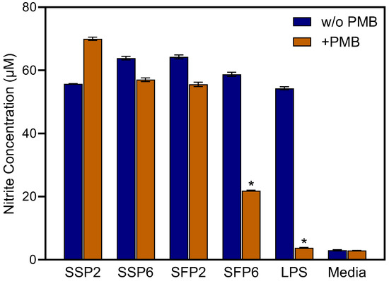 Figure 2. Effects of polymyxin B on NO production by polysaccharide-treated macrophages. Mouse macrophages pretreated with media (w/o PMB) or with 50 μg/mL polymyxin B (PMB) for 48 h were incubated with 20 μg/mL of the indicated polysaccharide fractions, media alone (negative control), or 100 ng/mL LPS (positive control). NO production was quantified by measuring nitrite in the cell-free supernatants. The data in each panel are presented as the mean ± S.D. of triplicate samples from one experiment that is representative of two independent experiments. Statistically significant differences (* p < 0.05) between samples treated with media and samples treated with polymyxin B are indicated.