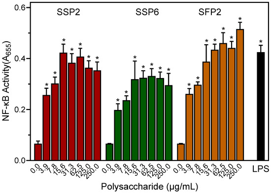 Figure 3. Effect of the Saussurea polysaccharides on AP-1/NF-κB activation. Human THP-1Blue monocytes (105 cells/well) were incubated for 24 h with the indicated concentrations of polysaccharide, media alone (0; negative control), or 100 ng/mL LPS (positive control). Alkaline phosphatase activity was analyzed spectrophotometrically (absorbance at 655 nm) in the cell supernatants, as described. Values are the mean ± S.D. of triplicate samples from one experiment, which is representative of three independent experiments. Statistically significant differences (* p < 0.01) between cells treated with media alone (0) and cells treated with SSP2, SSP6, SFP2, or LPS are indicated.
