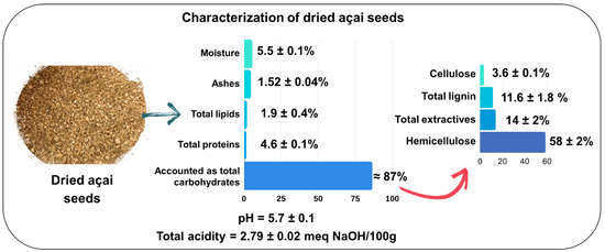 The structural carbohydrates were determined in the dried açai seed samples, after removing the extractives, followed by acid hydrolysis with H2SO4 72%, according to Sluiter et al. [31]. The contents of structural carbohydrates were calculated after the determination of furfural, hydroxymethylfurfural, total lignin, monomeric sugars, and acetic acid.