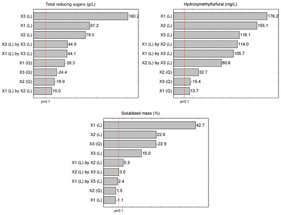Pareto charts for the standardized effect estimates (absolute values) on the contents of total reducing sugars, hydroxymethylfurfural, and solubilized mass after the acid hydrolysis of dried açai seeds using H2SO4. X1 = Acid concentration (%, w/v); X2 = Hydrolysis time (min); X3 = Solids concentration (%, w/v); (L): linear effect; (Q) quadratic effect.