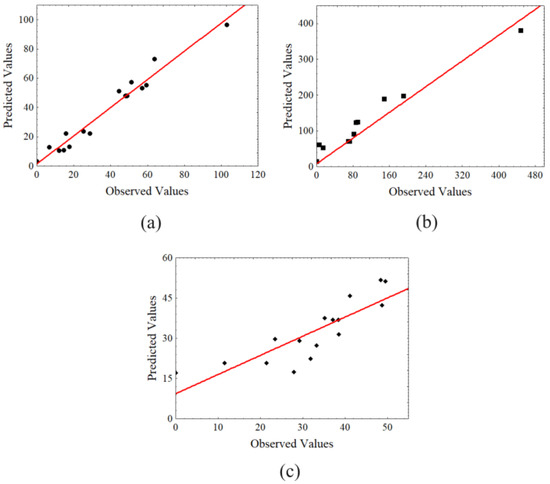Graph of the observed and predicted values of the experimental design with central composite and axial levels of the studied parameters (a) TRS, (b) HMF, and (c) solubilized mass.