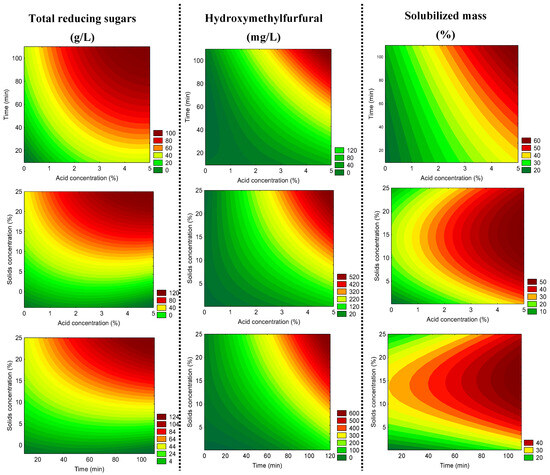 Concerning the formation of HMF after carbohydrate hydrolysis, the highest levels tend to be formed at longer times and both higher acid and solid concentrations, as expected. However, according to Figure 4, no relevant increase in the HMF contents is expected to be found as long as the acid concentration is kept below 2%, even at longer hydrolysis time and higher solids concentration. Lastly, in relation to the solubilized mass, the highest solubilization of lignocellulosic material in dried açai seeds will be achieved by the combination of the highest acid concentrations and hydrolysis time.