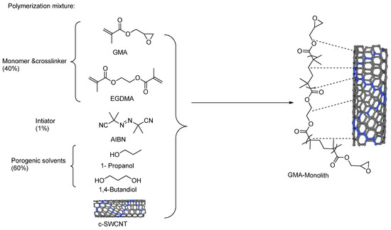 Carbon nanotubes (CNTs) are allotropes of carbon, usually called graphite sheets, mainly consisting of sp2-hybridised carbon atoms. They are wrapped into cylindrical structures and commonly capped by a fullerene-like design. Once this cylinder is rolled into a single wall, it leads to single-walled carbon nanotubes (SWCNTs). However, multi-walled carbon nanotubes (MWCNTs) are formed from more than one wall [27]. Both types of CNTs (i.e., SWCNTs and MWNTs) were successfully used as stationary phases in Gas Chromatography [28,29], Liquid Chromatography [30], Capillary Electrochromatography (CEC) [31,32,33,34], and pseudo-stationary phases in Capillary Electrophoresis [34,35,36,37]. They have also been reported to have applications as sorbents in solid-phase and micro-extraction [38]. By adding specific features of the CNTs into the monolithic column, novel stationary phases with enhanced performances were obtained. Pre-treated SWCNTs were incorporated into vinyl-benzyl chloride (vbc)-based monolithic SPs for micro-LC and CEC [39]. MWCNTs have also been put into polymerisation mixtures with GMA and BMA as monomers [40,41].