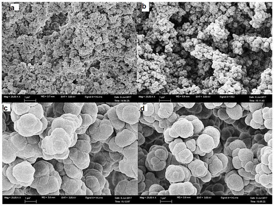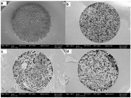 Scanning electron microscopy (SEM) has a vital role in studying the effect of the CS on the inner structure of the prepared monolithic capillaries. All prepared capillaries have inter-particle spaces in the uniform structures of the monolithic bed, with a heterogeneous surface of circular units inter-dispersed by large channels characteristic of the porous monolithic structures. Compared with plain and c-SWCNT-encapsulated monolithic capillaries (Figure 2a,b), the L1 and L2 capillaries have been shown to have relatively denser monolithic structures and soft microglobular surfaces caused by lipase coverage. Figure 2c,d and Figure 3c,d demonstrate the significant changes in the morphological properties caused by the immobilisation of lipase in the L1 and L2 capillaries.