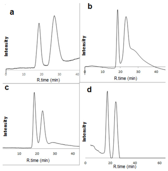 Investigating the prepared capillaries with a mixture of acetonitrile and water as the mobile phase in the 10–90% v/v range did not achieve any significant enantioselective resolutions. However, enantioselective separation was observed when a methanol-based mobile phase was used. This confirms the importance of solvent polarity in the chiral recognition mechanism. Furthermore, the use of buffers in mobile phases had a negative effect on the capillaries’ lifetime and their potential problems with nano-LC systems. The enantioseparation results were observed with long analysis times; this is because the Shimadzu LC-10AD VP pump used did not load more than a 6000 bar back pressure. Therefore, it was not possible to use higher flow rates to avoid the backpressure exceeding its maximum value.