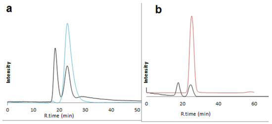 Enantioselective nano-LC separation of racemic diniconazol (a) on L1 capillary (black) and blank capillary (blue) using mobile phase: methanol/water 5:95 v/v, and glutamic acid (b) on L1 capillary (black) and blank capillary (orange) using mobile phase: methanol/water 30:70 v/v. UV: 219 nm; flow rate: 1 µL/min.