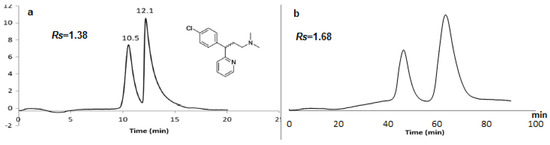 Enantioselective nano-LC separation of chlorpheniramine on a M1L capillary column (150 μm ID, 25 Cm length). Mobile phase: methanol/water (0.1% TFA) 30:70 v/v (a) (ref. [47]) and chlorpheniramine on L2 capillary column (150 μm ID, 25 Cm length). Mobile phase: methanol/water 20:80 v/v; (b) UV: 219 nm; flow rate: 1 µL/min.