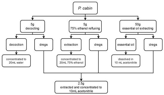 In this study, both the extraction solvent and the dregs were obtained for investigating residual changes for pesticides during P. cablin processing and kept in a hermetically closed container at −20 °C. The pesticides were detected within one day. The detailed production processes were: