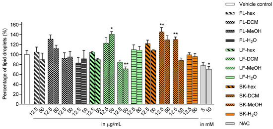 Based on the data presented in Figure 2, there were varying amounts of lipid droplets in the adipocytes treated with extracts compared to the control group. The LF-MeOH-treated adipocytes at 50 µg/mL showed a significant decrease in lipid droplets by 28.68% compared to the control, indicating antiadipogenic activity. A similar effect was observed in the positive control treatment with N-acetyl cysteine (NAC) at 10 mM for 29.55%. A slight decrease in lipid droplets was observed from treatment with hexane leaf extract (LF-hex) 50 µg/mL, BK-MeOH 50 µg/mL, LF-MeOH 12.5 µg/mL, FL-H2O 12.5 µg/mL, and NAC 5 mM by 10.18, 11.9, 15.35, 16.81, and 22.14%, respectively. Conversely, 12.5 µg/mL of BK-MeOH, 50 µg/mL of dichloromethane leaf extract (LF-DCM), and 12.5 µg/mL of dichloromethane bark extract (BK-DCM) significantly increased lipid droplets by 30.4%, 40.9%, and 45.9%, respectively.