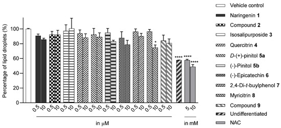 Estimated lipid content from ORO staining assay on the 3T3-L1 adipocytes treated with isolated compounds during differentiation. NAC = N-acetyl cysteine. Data in mean ± SEM, * p = 0.03 of compound 8 10 µM; **** p = 0.00008 of undifferentiated group and NAC, vs. vehicle control (n = 3, One-way ANOVA, Tukey’s post hoc).