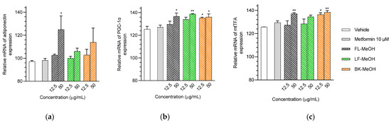 The relative expression of (a) mRNA of adiponectin, (b) PGC-1α, and (c) mtTFA of 3T3-L1 adipocytes treated with MeOH extracts. The gene expression was normalised by the housekeeping gene β-actin. FL-MeOH = methanolic extract of flower, LF-MeOH = methanolic extract of leaf, BK-MeOH = methanolic extract of bark. Data in mean ± SEM; * p = 0.01 of FL-MeOH and BK-MeOH 50 µg/mL in experiment (b) and BK-MeOH 12.5 µg/mL in experiment (c); * p = 0.02 of FL-MeOH in experiment (a); * p = 0.03 of BK-MeOH 12.5 µg/mL in experiment (b); ** p = 0.002 of LF-MeOH in experiment (b); ** p = 0.003 of BK-MeOH 50 µg/mL in experiment (c); ** p = 0.006 of FL-MeOH in experiment (c), vs. vehicle control (n = 3, One-way ANOVA, Tukey’s post hoc).