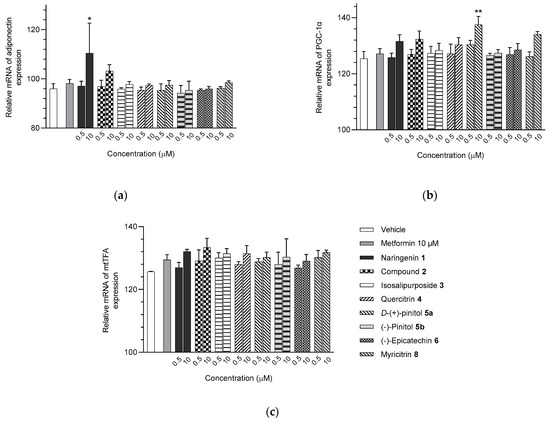 At a concentration of 0.5 μM, all isolated compounds caused a slight increase in transcriptional levels of adiponectin, PGC-1α, and mtTFA mRNA, as shown in Figure 5 and Table S5. However, when incubated at 10 μM, naringenin 1 resulted in a 14.42% increase in adiponectin expression, while (+)-pinitol 5a led to a 12.1% increase in PGC-1α expression.