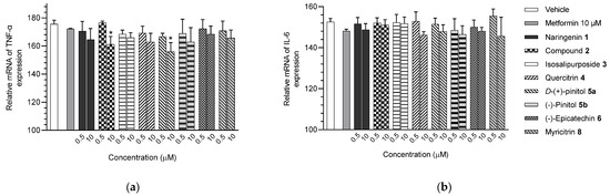 The isolated compounds reduced the mRNA expression of two pro-inflammatory adipokines, as shown in Figure 7 and Supplementary Table S5. When treated with naringenin-7-O-α-L-arabinofuranoside 2 and D-(+)-pinitol 5a at 10 μM, there were slight decreases in TNF-α expression by 14.2 and 19.6%, respectively. Additionally, treatment with naringenin 1 and quercitrin 4 at the same dose decreased TNF-α expression by 11 and 12.7%, respectively. However, there was only a minimal inhibitory effect on the expression of IL-6 mRNA when treated with naringenin 1, quercitrin 4, D-(+)-pinitol 5a, and naringenin-7-O-α-L-arabinofuranoside 2 at the same concentration. These results suggested that FL-MeOH inhibited TNF-α expression mainly through naringenin 1, quercitrin 4, and compounds 2 and 5a. Inhibition of IL-6 expression may be due to other unisolated compounds in the extract. Our findings suggest that extracts and phytoconstituents from A. saligna can potentially protect adipocyte mitochondria against the harmful effects of pro-inflammatory cytokines, such as TNF-α and IL-6, which have been known to hamper the adiponectin pathway and mitochondrial biogenesis [23,24].