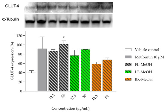 The relative expression of GLUT-4 protein of 3T3-L1 adipocytes treated with MeOH extracts. The expression was normalised by the housekeeping α-tubulin. Data were in mean ± SEM; * p = 0.011 of FL-MeOH 50 µg/mL, vs. vehicle control (n = 2, One-way ANOVA, Tukey’s post hoc).