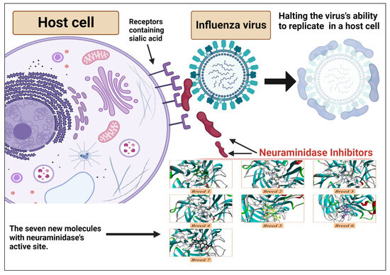 Developing new neuraminidase inhibitors is vital for combating evolving flu strains, enhancing treatment options, reducing resistance, and safeguarding global public health against influenza outbreaks. The objective of this research was to identify novel inhibitor molecules against the neuraminidase of influenza. To develop novel neuraminidase inhibitors, we used a breed-based de novo approach. According to the docking studies, seven breed molecules (Breeds 1–7) demonstrated high stability within the neuraminidase receptor compared to the clinical neuraminidase inhibitors (zonamivir, oseltamivir, and peramivir). On the other hand, to reach the pharmacological target, the pharmacokinetics of the seven breed compounds were investigated, and the results show that they have excellent pharmacokinetic profiles, such as bioavailability and permeability toward biological membranes. The molecular dynamics simulations for 100 ns revealed that the seven breed molecules (Breeds 1–7) were particularly stable in the active site of neuraminidase. In addition, MM-PBSA computations demonstrated that the complexes were very stable throughout the duration of the simulation. This research can contribute to the development of novel and potent neuraminidase inhibitor drugs for the treatment of influenza and could give researchers the opportunity to examine these breed molecules for the treatment of influenza and its symptoms. Finally, the future of neuraminidase inhibitors for the flu involves improved efficacy, reduced resistance, and personalized treatments, aiding in better management and prevention of influenza outbreaks.