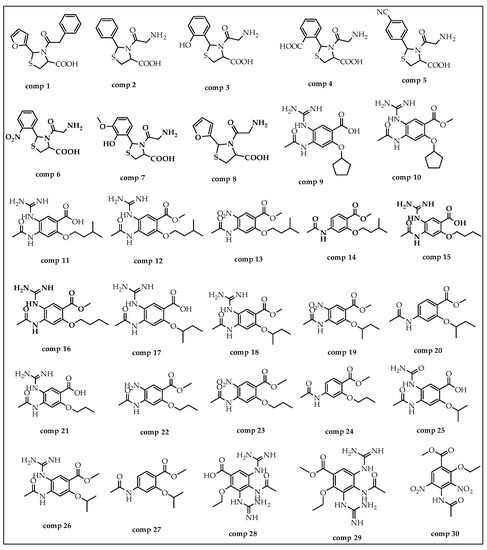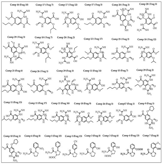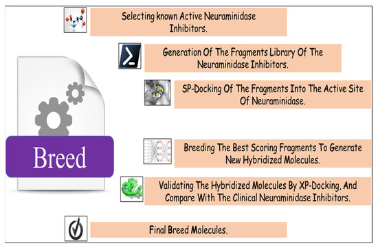 In this step, we used Maestro software (Maestro, version 11.8, 2018, Schrödinger, New York, NY, USA). In breed-based de novo drug design, cocrystalized compounds from diverse PDB structures or well-known inhibitors against a particular target must be used [18]. Numerous neuraminidase inhibitors from the literature were gathered for this investigation (Figure 12) [30,31]. The LigPrep module, which created the low-energy ligand conformer using the OPLS3e force field [32], optimized the 3D structures of 30 compounds. Diverse fragments were produced from these structures using the run.\fragment_molecule.py program at the Schrödinger powershell command line with the appropriate input and output folders. The fragments were docked into the active site of the receptor using SP docking, and the best-scoring fragments were combined using the Breed Ligand Creation Panel [18]. The molecule was hybridized by a breed panel, utilizing three different settings. It should be recalled that two bonds must be of the same order to start and maintain the hybridization (geometry) of the bonded atoms in the new molecule. Additionally, the atoms at the bond ends need to be close to one Å of another [18]. According to Pierce et al. [18], the angle between the bond vectors of two bonds cannot be greater than 15°. The first half of molecule one and the second half of molecule two combine to form a new molecule if the initial molecules are divided in half at the matching bond. The other new molecule is created by joining the first half of molecule two and the second half of molecule one. The atom types, sites, and bonds of the new molecules are identical to those of the corresponding atoms [19]. The procedure for drug discovery, in general, is a difficult challenge for organic chemists due to the complexity of the pharmacophore feature that increases the properties and efficiency of a drug [33]. Chemists commonly use their specialized knowledge and carry out compound tweaking by hand by adding and removing functional groups. Nevertheless, chemists must carry out each alteration step by hand even if they use methods that forecast the ideal chemical attributes. Every iteration of this process might take many hours, and there might still be no promising candidate medication [18]. The breed-based de novo hybridization approach used in this investigation is shown in Figure 13.