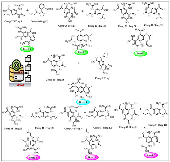 A breed-based de novo strategy was employed in the current investigation to develop new neuraminidase inhibitors. A total of 282 different fragments were generated from thirty potent neuraminidase inhibitors using the Schrödinger PowerShell command “run.\fragment_molecule.py”. We initially docked all the generated fragments (282) in the active site of neuraminidase using SP docking. Figure 2 and Figure 3 show all fragments with docking scores greater than −6 Kcal/mol, while Table 1 reveals the SP docking scores of the top fragments. Compounds 28, 17, 11, 9, 21, 4, 5, 3, and 29 produced high-scoring fragments (between −7.002 and −8.700 Kcal/mol) with the neuraminidase receptor. The breed de novo hybridization approach has now progressed toward fully automating the design process, which could significantly accelerate the procedure and produce better results [20]. The top fragments (with docking scores greater than −6.0) were selected for the breed de novo hybridization process. Subsequently, all 67 novel breed compounds, including zanamivir and clinical neuraminidase inhibitors (oseltamivir and peramivir), were selected for SP rather than the process of XP docking into the active site of neuraminidase. The best breed molecules, with breed scores between 7.886 and 15.623, were as follows: Breed 1 was obtained through hybridization of comp17 (frag5) and comp4 (frag13); Breed 2 was obtained through hybridization of comp28 (frag3) and comp17 (frag7); Breed 3 was obtained through hybridization of comp28 (frag3) and comp17 (frag12); Breed 4 was obtained through hybridization of comp28 (frag3) and comp9 (frag1); Breed 5 was obtained through hybridization of comp28 (frag3) and comp11 (frag13); Breed 6 was obtained through hybridization of comp28 (frag3) and comp11 (frag17); and Breed 7 was obtained through hybridization of comp28 (frag3) and comp11 (frag16), as illustrated in Figure 4.