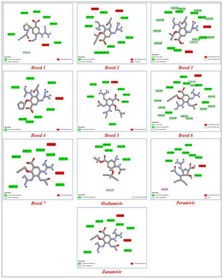 Antivirals are essential to the control and prevention of influenza. Oseltamivir and zanamivir are the only neuraminidase inhibitor medications that are now licensed globally. Recently, laninamivir and peramivir gained permission in Japan [22]. To know more about how breed molecules inhibit the vital function of the neuraminidase of influenza virus, we docked oseltamivir and peramivir into the neuraminidase receptor. The results obtained indicate that the seven new breed compounds had binding affinity values between −10.529 and −11.867 kcal/mol, and the binding affinity value of reference molecules (zanamivir) was −9.848 kcal/mol, while the clinical inhibitors peramivir and oseltamivir had binding affinity values of −8.844 and −6.326 kcal/mol, respectively. These results demonstrate that the seven breed molecules formed very stable complexes with the active site of neuraminidase. The docking modeling results and the breed score are presented in Table 2. The important information we obtained from this study is that hydrogen-bonding interactions are responsible for inhibitory activity. The amino acids in the active site of neuraminidase that interacted with the seven types of molecules via hydrogen bonds were Arg119, Trp180, and Glu278. The best molecule (Breed 1) interacted with the amino acids Asp152, Arg226, and Glu226 at a distance between 1.61 and 3.33 Å; on the other hand, the reference molecule (zonamivir) interacted with the amino acids Asp152, Glu229, Glu278, Glu279, and Arg372 at a distance between 1.50 and 4.15 Å. This result indicates that the interaction with the amino acids Arg226 and Glu226 plays a very important role in inhibiting the vital function of neuraminidase. Similar to hydrogen bonds formed between molecules (Breed 2–Breed 7) with amino acids Arg119, Trp180, and Glu278, other hydrogen bonds with amino acids Glu120, Arg153, Arg194, Glu229, Glu279, and Arg372, with distances ranging from 1.22 to 5.98 Å, formed stable complexes with the neuraminidase receptor compared to neuraminidase with zanamivir, peramivir, and oseltamivir complexes. Figure 4 shows the binding interactions of the seven tested molecules, zanamivir, peramivir, and oseltamivir, with neuraminidase inhibitors.