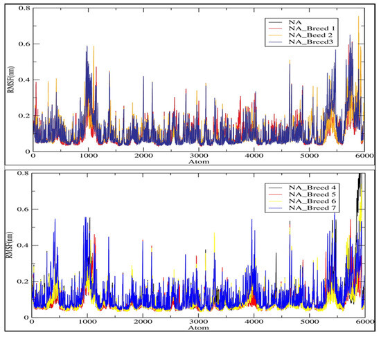 The rest of the complexes were very stable during the simulation period. The average RMSD values for the NA and its complexes with Breed 1, Breed 2, Breed 3, Breed 4, Breed 5, Breed 6, and Breed 7 were 0.148, 0.149, 0.131, 0.135, 0.166, 0.172, 0.172, and 0.148 nm, respectively. Finally, the RMSD analysis indicated that the MD trajectories were generally stable during the 100 ns of simulation and were able to help in the development of new influenza virus inhibitors. In this research, we calculated the root-mean-square fluctuation (RMSF) of the neuraminidase (NA) and its complexes with Breeds 1–7, as shown in Figure 6. This study showed that more flexibility during the molecular dynamic simulation was shown by higher RMSF values, whereas good stability of the complex was reflected by lower RMSF values. The analysis revealed that the average RMSF for the neuraminidase and its complexes was less than 0.123 nm. The average RMSD for the neuraminidase was 0.106 nm, while neuraminidase complexes (NA Breeds 1–7) had average RMSF values that ranged from 0.100 to 0.123 nm, demonstrating the structural stability and little atomic movement of the neuraminidase and its complexes. On the other hand, the NA Breed 1–7 complexes had higher fluctuations at atoms 450, 1000, 5400, and 5800 of the neuraminidase protein, with RMSF values ranging between 0.4 and 0.6 nm. These findings indicate that the interactions of the breed molecules with the neuraminidase caused conformational changes and increased the protein dynamics in those particular regions. The results obtained (Table 5) indicate that these breed molecules (Breeds 1–7) with the active site of the neuraminidase form good, stable complexes [23].