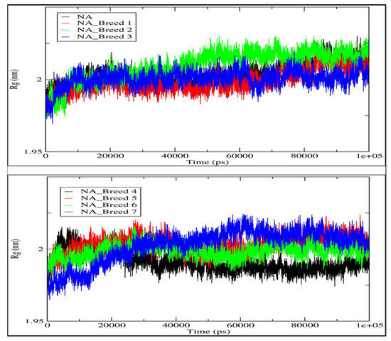 We estimated the radius of gyration (Rg) of each system to assess the stability of the neuraminidase and its complexes (NA_Breed 1–7) during the 100 ns simulation (Figure 7). In general, the greater the Rg was, the less compact the Neuraminidase_Breed 1–7 complexes were. During the MD simulation, Rg was employed to determine whether the complexes were stably folded or unfolded. The average Rg value of the neuraminidase was determined to be in the range of 2.003 nm. Moreover, the average Rg values of NA_Breed 1, NA_Breed 2, NA_Breed 3, NA_Breed 4, NA_Breed 5, NA_Breed 6, and NA_Breed 7 complexes were 1.998, 2.009, 2.000, 1.991, 2.003, 1.998, and 2.002 nm, respectively. As previously stated, if a protein maintained a relatively constant value of Rg throughout the MD simulation, it was considered to be stably folded; if its Rg changed over time, it was considered to be unfolded [26,27]. Overall, our results suggest that all the tested molecules formed stable complexes with NA and were able to inhibit the vital function of the neuraminidase.