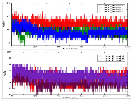 We analyzed the hydrogen bond profiles of the seven complexes to obtain a better understanding of the interaction between the breed molecules and neuraminidase, as shown in Figure 8. The formation of hydrogen bonds between a ligand and a receptor is necessary for the ligand-protein complex to be stable [28]. Our analysis revealed that the NA_Breed 2 and NA_Breed 7 complexes formed averages of 12.444 and 12.064 hydrogen bonds during the simulation. The rest of the complexes formed average hydrogen bonds of between 9 and 11. The existence of more polar groups in the breed molecules (Breed 2 and Breed 7) made it possible to form more hydrogen bonds with the active site of the neuraminidase, in addition to having a strong binding interaction. The rest of the complexes, on the other hand, had some less polar groups and, thus, formed fewer hydrogen bonds with the neuraminidase receptor. This research indicates that hydrogen bonding interaction is essential in the stabilization of the breed molecule with neuraminidase.