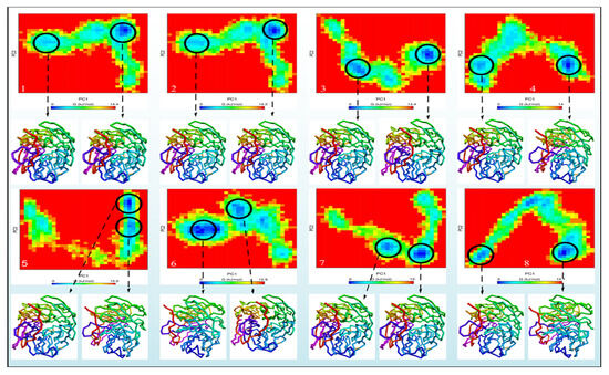Gibbs free-energy landscapes were also produced using the first two PCs to differentiate the conformational modes of the neuraminidase and its complexes (NA Breeds 1–7). The Gibbs free-energy landscapes examined the orientation of the backbone atom fluctuation in neuraminidase and neuraminidase complexes (NA Breeds 7–1) from the MD trajectory. The Gibbs energy landscape plot following 100 ns of simulation, with the extracted structures from low-energy regions for each system, is shown in Figure 10. The results demonstrate that the NA had a Gibbs free energy of 0–14.4 KJ/mol, while the NA_Breed 1–7 complexes had Gibbs free energies of 0–14.2, 0–14.4, 0–14, 0–15.6, 0–12.9, 0–15, and 0–14.1 KJ/mol, respectively.
