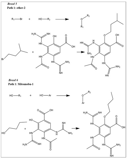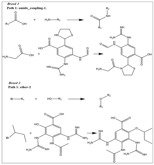 At this step, we used reaction-based enumeration to predict the synthetic pathways of the breed molecules (Breeds 1–7). It is another Schrödinger tool for predicting the synthetic pathway of every molecule using a retro-synthetic methodology. The reaction enumeration tool showed that the amide coupling, ether, and Mitsunobu reactions could be utilized to synthesize all of the breed molecules, as described in Figure 11.