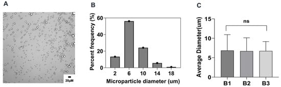 Microparticle size distribution of reference formulation: (A) optical micrograph of the microparticle, (B) histogram of the microparticle size distribution of a representative batch, (C) batch-to-batch comparison of the mean values of three independent batches of the reference formulation. B1: Batch 1, B2: Batch 2, and B3: Batch 3. ns indicates no significance.