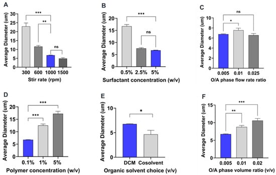 Comparison plots of the influence of individual conditions tested for all process parameters on microparticle size. (A–F). Blue bars represent each individual reference parameter selected from the reference formulation. One-way ANOVA: * p < 0.05, ** p < 0.01, and *** p < 0.001 Student’s t test: * p < 0.05 and ** p < 0.01. ns indicates no significance.