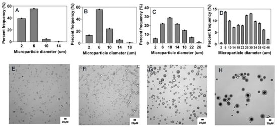Effect of stirring rate (rpm) on microparticle size and distributions. Optical micrograph and histogram of particle size distribution: (A,E) 1500 RPM, (B,F) 1000 RPM, (C,G) 600 RPM, and (D,H) 300 RPM.