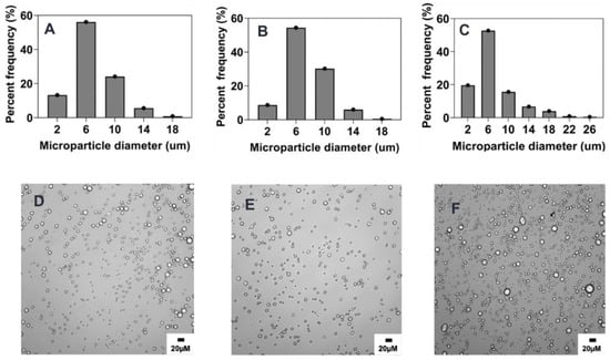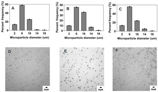 Effect of polymer concentration (%w/v) on microparticle size and distributions. Optical micrograph and histogram of particle size distribution: (A,D) 5% w/v, (B,E) 1% w/v, (C,F) 0.1% w/v.