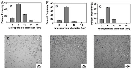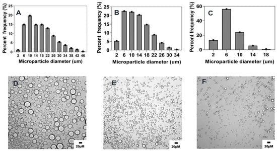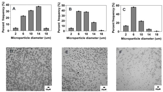 Effect of surfactant (PVA) concentration (% w/v) on microparticle size and distributions. Optical micrograph and histogram of particle size distribution: (A,D) 5% w/v, (B,E) 2.5% w/v, (C,F) 0.5% w/v.