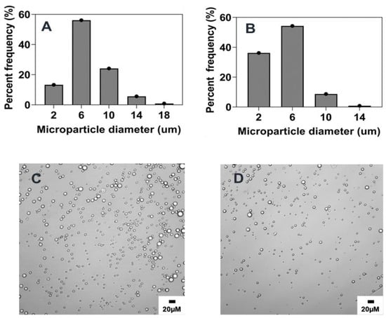 The size of the microparticles has also been described to be influenced by the variation of the volume ratio of both the organic and aqueous phases [27,30,39]. For this investigation, the volume of the aqueous phase was maintained at a constant 20 mL, and the volume of the dispersed phase was increased from 0.1 mL to 0.4 mL, constituting an organic: aqueous phase volume ratio of 0.005% v/v and 0.02% respectively. As shown in Figure 8 and Figure 2F and Table 1, the size of the microparticles increased (p < 0.01) from 6.8 ± 0.1 µm to 10.6 ± 0.6 µm, with a corresponding elevation in particle concentration or number of particles formed as the phase volume ratio was increased. This observation aligns with similar findings reporting the role of the viscosity of the emulsion due to an increase in the dispersed phase as a justification for the increase in particle size [20,30]. Other explanations could be the increase in the tendency of collision and coalescence among the dispersed oil droplets as a higher phase volume ratio allows for a lesser distance between the aqueous and organic phases, leading to poor phase separation [40,41].