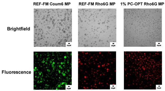 Consistent with previous findings, these observed differences in drug loading and encapsulation efficiency can be attributed to the distinct physicochemical properties of the dyes [44,45]. The hydrophilicity of rhodamine necessitates enhanced diffusion of the dye out of the emulsion droplets into the external aqueous phase during microparticle production. In contrast, the hydrophobic nature of coumarin facilitates its efficient loading into the hydrophobic PLGA core of the polymer matrix. Thus, these findings underscore the significant influence of the physicochemical properties of biomolecules on their loading efficiency within polymeric carriers [30]. Further characterization of the successful incorporation of these dyes into the microparticles was visually confirmed using a fluorescent microscope (Leica DMI 6000), as shown in Figure 11.