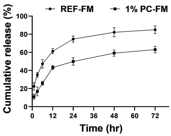 Release profiles of R6G loaded particles from REF-FM and 1%PC-FM in PBS (0.01 M, pH 7.4) under 37 °C shaker incubator (n = 3).