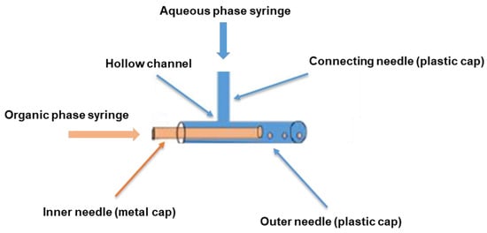 Typical of all co-flow-based droplet formation devices, the design of our coaxial needle construct was based on a co-flow geometry to facilitate the parallel flow of the dispersed and continuous phases to each other [32,55]. As shown in Scheme 1, the assembly of our simple handmade construct was achieved using three blunt-tip syringe needles with a length of 1.5 inches each. Two of these needles were 16 G needles with plastic-based luer ends, while the third needle was a 30 G Hamilton needle with a luer end made of stainless steel. The plastic base of one of the 16 G needles was punctured and carefully drilled to create a uniformly sized hollow channel using a sharp-tipped 16 G needle to allow the flow of the aqueous phase. Subsequently, the second blunt 16 G needle was inserted gently through the generated hollow channel in the first needle to establish a connection with the first needle. The blunt 30 G Hamilton needle was then inserted centrally along the main axis of the first 16 G needle bearing the orifice. For the purpose of achieving a stable and centered configuration, the resulting assembly was firmly bonded using either parafilm or a suitable adhesive, such as super glue. In this setup, the slender tip of the stainless-steel base of the inner 30 G needle was securely positioned on the wider end of the plastic base of the outer 16 G needle bearing the drilled hollow channel.