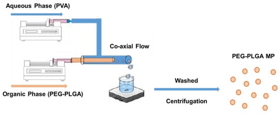 All microparticles were synthesized using a phase separation method based on coaxial needle technology. In detail, the two phases, organic and aqueous, were prepared independently and stored in clean containers. The organic phase consisted of PEG-PLGA polymer dissolved at a desired concentration in dichloromethane (DCM), while the aqueous phase consisted of polyvinyl alcohol (PVA) in deionized (DI) water. The PVA solution was made by dissolving the desired amount of PVA in boiling water to obtain a homogenous solution. Upon cooling, the solution was centrifuged (100× g, 5 min) and/or filtered through a 0.45 μm syringe filter with the help of a syringe pump to remove any particulate matter. The glass syringe containing 0.1 mL of organic phase was then placed on a syringe pump (New Era Pump Systems, Inc. in Farmingdale, NY, USA) and connected to the concentrically fixated stainless-steel end of the coaxial needle. A 20 mL plastic syringe filled with aqueous phase was connected to the female luer end of the PVC tubing and placed on a second syringe pump. As illustrated in Scheme 2, the complete assembly of the setup was achieved by connecting the male luer end of the PVC tubing to the plastic end of the coaxial needle gently initiating the co-flow of the two phases into a collecting vessel such as a beaker or PTFE evaporation dish containing 5 mL of PVA solution undergoing continuous stirring at 1000 rpm. Unless stated otherwise, all microparticles were made by setting the flow rate of the co-flow system at 0.1 mL/h for the organic phase and 20 mL/h for the aqueous phase. Following the utmost injection of the volume of the phases, the emulsion was continuously stirred for another hour to ensure complete evaporation of the DCM and solidification of the synthesized microparticle. To remove any residual PVA, the microparticle suspension was collected in a 50 mL falcon tube and washed twice with DI water via centrifugation at (100× g, 5 min). Afterward, the microparticles were transferred into a 2 mL microcentrifuge tube and subjected to a final wash before resuspending the eventual microparticle pellet in 0.5 mL of DI water for further studies. For the fabrication of microparticles, we conducted a preliminary analysis of the type of stirrer plate and magnetic stir bar size to be used across all runs.