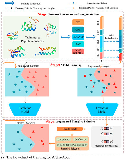 Therefore, in this work, we propose an augmented-sample selection framework, called ACPs-ASSF, for the prediction of anticancer peptides to ensure the controllability of data augmentation by excluding noisy samples. ACPs-ASSF is capable of selecting high-quality augmented samples for automatic training. A flowchart of the proposed method is shown in Figure 1. First, the features are extracted from peptide sequences and augmented samples are obtained by adding perturbations. Then, the prediction model is trained by training set samples, the augmented samples are fed into the prediction model, pseudo-labels are computed, and the model prediction uncertainty is estimated. Augmented samples with low uncertainty, high confidence, and pseudo-labels consistent with the original labels are selected, and the selected samples are merged into the training set to retrain the model. Several iterations of the above process are performed to ensure that the samples chosen will be useful for model training. Finally, the testing samples are input into the trained prediction model, and the prediction labels are obtained.