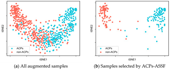 Figure 2a demonstrates the distribution of all augmented samples in ACP240. The augmented samples formed two class clusters, with ACPs mainly distributed in the lower right of the plane, non-ACPs mainly in the upper left, and a region of overlap in the middle. As shown in Figure 2b, after ACPs-ASSF selection, noisy samples in the middle of the two class clusters, as well as those outside the class cluster distribution, were eliminated, and the selected samples exhibited a larger inter-class distribution distance.