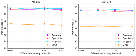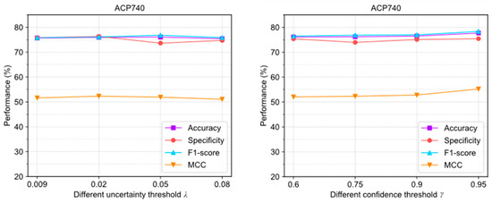 The performance changes of ACPs-ASSF on the ACP240 and ACP740 datasets under different uncertainty threshold settings.