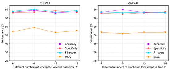 The performance changes of ACPs-ASSF on ACP240 and ACP740 datasets under different numbers of stochastic forward pass time settings.