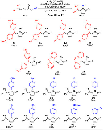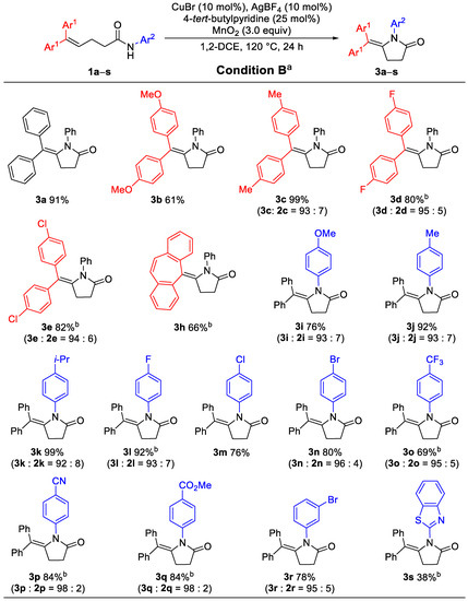 Next, we investigated the synthesis of 5-alkylidene-pyrrolidin-2-ones using MnO2 as the oxidant (Scheme 3). When the reaction of 1a was performed with CuBr (10 mol%), AgBF4 (10 mol%), 4-tert-butylpyridine (25 mol%), and MnO2 (3.0 equiv) in 1,2-DCE, at 120 °C, for 24 h (condition B) [40,41,42], 5-alkylidene-pyrrolidin-2-one 3a was obtained in a high yield (for details, see Supplementary Materials). Using these optimized conditions, we then explored the scope and generality of the 5-alkylidene-pyrrolidin-2-one synthesis. Substrates with various functional groups on the diarylethylene moieties were first examined and afforded the corresponding cyclized products with high selectivities (3b–e). Subsequently, the reaction of amide bearing tricyclic dibenzo[a,d]cycloheptene scaffold proceeded smoothly (3h). Finally, the effect of aryl groups on the nitrogen atoms was investigated. Substrates possessing benzene derivatives on their amide nitrogen atoms smoothly underwent cyclization (3i–r). This process could also be applied to N-benzothiazole-substituted amide, which, however, afforded a low yield (3s).