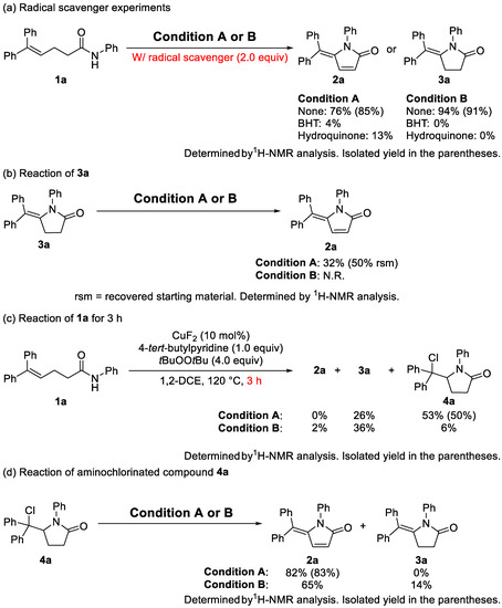 Having studied the scope of the reaction, we next conducted experiments to obtain an insight into the reaction mechanism (Scheme 4). First, under both optimized conditions, the reactions were performed in the presence of the radical scavengers 2,6-di-tert-butyl-4-methylphenol (BHT) or hydroquinone, which led to a significant decrease in the yield of 2a (condition A) or 3a (condition B) (Scheme 4a). These results suggest that the reactions proceeded via radical processes. Next, to investigate the possibility of saturated-r-lactam 3a acting as an intermediate for 2a, the reaction using 3a as a substrate was conducted under condition A (Scheme 4b). Consequently, 2a was obtained in 32% yield, indicating that 3a is one of the intermediates in the synthesis of 2a. In contrast, we recovered the starting material 3a under condition B. Furthermore, regarding α,β-unsaturated-γ-alkylidene-γ-lactam 2 synthesis, we shortened the reaction time to unveil the reaction intermediate, and aminochlorinated product 4a was obtained in a good yield (Scheme 4c). The structure of 4a was confirmed by X-ray crystallographic analysis (for details, see Supplementary Materials). Contrary, the reaction under condition B for 3 h produced only 6% of 4a. Subsequently, the reaction starting from 4a under condition A proceeded smoothly, suggesting that 4a is a possible intermediate for the synthesis of α,β-unsaturated-γ-alkylidene-γ-lactam 2a (Scheme 4d). Additionally, transformation of 4a under condition B also proceeded to afford 2a in good yield. From these results, we assume that the preference for either 2 or 3 is determined by whether aminochlorinated compound 4 is formed in situ.