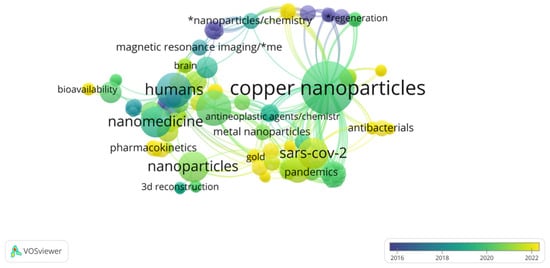 Figure 2 confirms that the main works mentioned are from 2018. In addition, the exceptions mentioned concerning the previous work are highlighted in purple. The bibliographic analysis indicated strong links between copper nanoparticles and medicine (or rather, nanomedicine), which can supportive the protection of human health and life, pointing to features such as biodegradability, antibacterial properties, or pharmacokinetic studies of how the body interacts with copper NPs for the entire duration of exposure. Chemistry is also important because of the necessity of the correct synthesis of these compounds and determination of the reaction mechanisms occurring in the system under consideration.