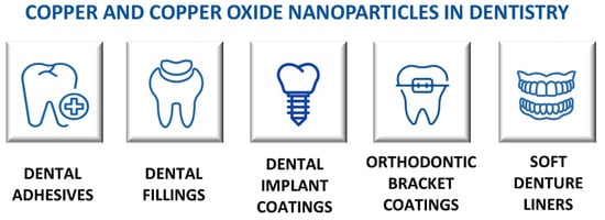 The antibacterial/antifungal properties and the ability to accelerate the healing of infected wounds of copper nanomaterials have increased their applicability to other areas of medicine, such as dentistry [66]. Copper nanoparticles can be added to dental adhesives, dental filling materials, dental implant coatings, orthodontic bracket coatings, or soft denture liner materials (Figure 4) [67]. Modifying dental materials with copper nanoparticles provides antibacterial properties and enhances (or maintains) their adhesive or mechanical properties. Vidal et al. [68] carried out ex vivo studies with extracted caries-free human third molars to investigate the impact of copper nanoparticles on the final properties of universal dental adhesive. It was shown that dental adhesives containing 0.1% copper nanoparticles exhibited antibacterial activity against S. mutans and enhanced adhesive properties. However, the elastic modulus and hardness of the resin–dentin interface remained unchanged, indicating that the mechanical properties were not improved. These ex vivo experiments were performed in a cariogenic oral environment to reflect the natural conditions of the oral cavity. Copper nanoparticles can serve as an antibacterial agent for the disinfection of the root canal system during endodontic therapy [69]. Rojas and co-authors compared the bacteriostatic properties of copper nanoparticles with calcium hydroxide, commonly applied as an intracanal dressing [69]. Antibacterial properties were evaluated on a multispecies biofilm in a root canal ex vivo model. Copper nanoparticles and calcium hydroxide both inhibited bacterial biofilm formation; however, there were no significant differences between their bacteriostatic action against S. mutans and E. faecalis. The highest decrease in the bacterial population was observed on seven days of exposure. The authors emphasised that copper nanoparticles can be used as an alternative intracanal dressing to suppress dental infections caused by Ca(OH)2-resistant multispecies endodontic biofilms [69]. Kang et al. [70] designed microporous titanium dioxide coatings doped with nanostructured copper oxides (I and II) to facilitate osteogenic differentiation and bacteriostatic properties of dental implants. Cu2O-doped coatings showed better antibacterial properties against Staphylococcus aureus and Porphyromonas gingivalis than CuO-doped coatings. Moreover, Cu2O-doped TiO2 coatings also showed a better effect on bone mesenchymal stem cell proliferation and adhesion than undoped TiO2 and CuO-doped coatings. The authors observed the changes in the surface properties of Cu-doped TiO2 coatings. The presence of copper reduced their wettability by about 40% [70]. As dental healthcare continues to develop, the incorporation of copper nanoparticles into dental materials will confirm their potential to transform infection control and enhance dental implant functionality.